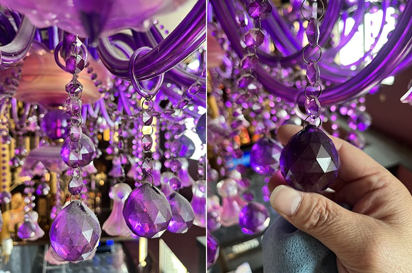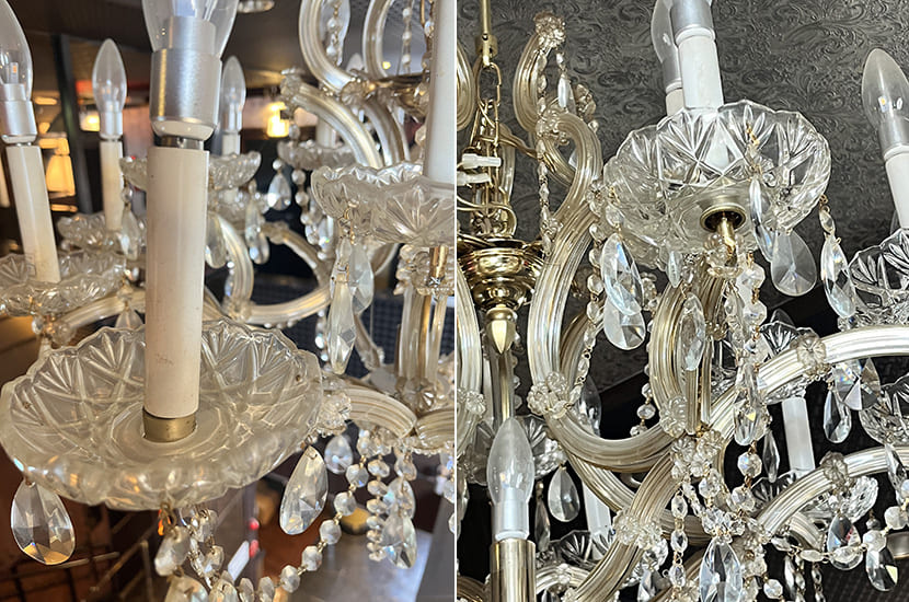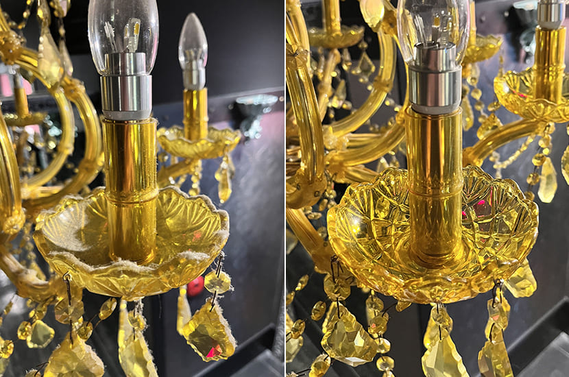 汚れの種類もホコリやタバコのヤニ、クモの巣や虫の死骸など様々。シャンデリアを扱って20年の経験と知識で慎重かつ丁寧に作業致します。クリーニングでシャンデリア本来の美しい輝きと魅力を復活させましょう!